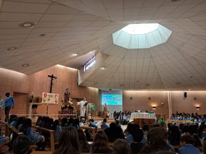 La jornada comenzó con la Eucaristía, en la que participaron los alumnos desde 4º de Primaria hasta 4º de ESO, acompañados por el coro del colegio, que llenó la capilla de música y alegría. Para los más pequeños, la celebración se adaptó a su edad: